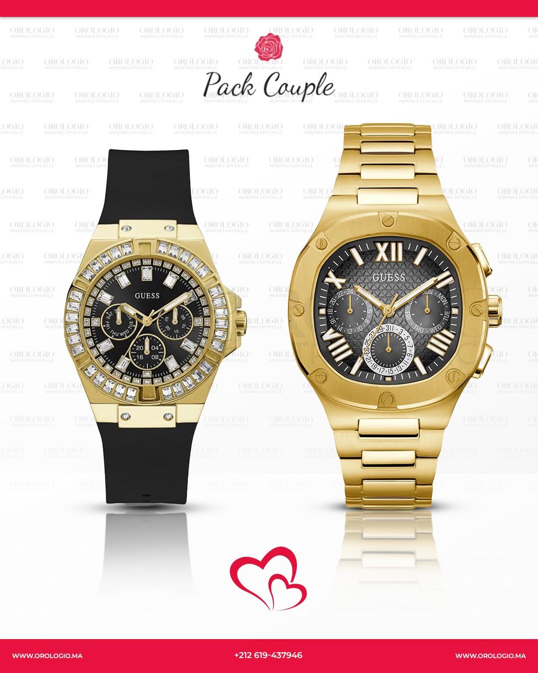 Chez OROLOGIO, vous pouvez choisir un modèle pour lui et un modèle pour elle parmi nos collections exclusives, Ajoutez-les à votre panier et profitez d’une remise spéciale sur le montant total en entrant le code promo « COUPLE » lors de la validation de votre commande. Offrez-vous le luxe, ensemble.