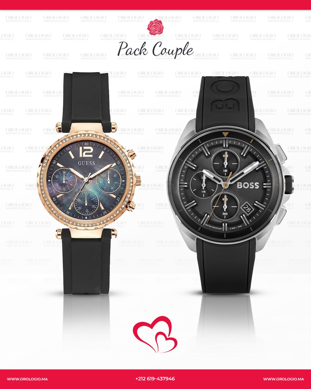 Chez OROLOGIO, vous pouvez choisir un modèle pour lui et un modèle pour elle parmi nos collections exclusives, Ajoutez-les à votre panier et profitez d’une remise spéciale sur le montant total en entrant le code promo « COUPLE » lors de la validation de votre commande. Offrez-vous le luxe, ensemble.